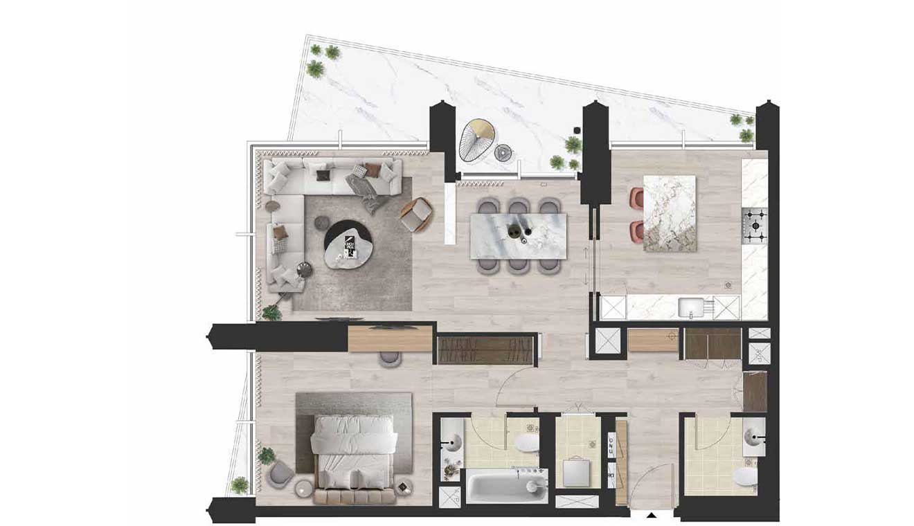 DIFC Living’s tower is a visual masterpiece, featuring interlocking geometries and a captivating twisted cube at its zenith—an embodiment of avant-garde design. Beyond its aesthetic appeal, this unique architectural feat serves a functional purpose. Embracing Biophilic design principles, the building optimizes natural lighting and ventilation, fostering a wholesome environment for its residents. Throughout the tower, outdoor terraces and numerous verdant spaces offer serene retreats from the urban hustle and bustle.